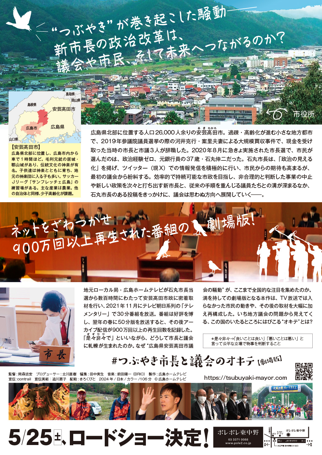 地方発のテレビ・ドキュメンタリーが面白い。しかも本作品のように、正面から政治や法制度を扱いつつも、地元に根付いた視点で説得力がある。それは国の政治家は自分の保身しか考えていないし、メディアも政局にしか興味がない(としか思えない)番組作りの中で、地方の首長が本気で改革を志向し、真の意味の守旧派たる地元の領袖や、場合によっては大手マスコミと対峙する姿をみせているからだろう。本作も、SNSで名を馳せる広島の一地方で起きた政治格闘劇をありのままを見せ、いったい政治とは政治家とは何かを見た者に問いかけ続ける106分だ。自分の主張に合わないメディアを切り捨てる市長の手法は、民主主義を壊す危険性を秘めており強く危惧するところで、その意味で受け入れられた側のメディアとしての視点での作品という側面を否定しきれない。それでもスクリーンにさらけ出すことで見えてくるものがあるという点で、番組にし映画にした意義はとても高いと思う。いまの政治に諦めている人、ジャーナリズムは不要と思っている人にこそ、是非見てほしい作品だ。